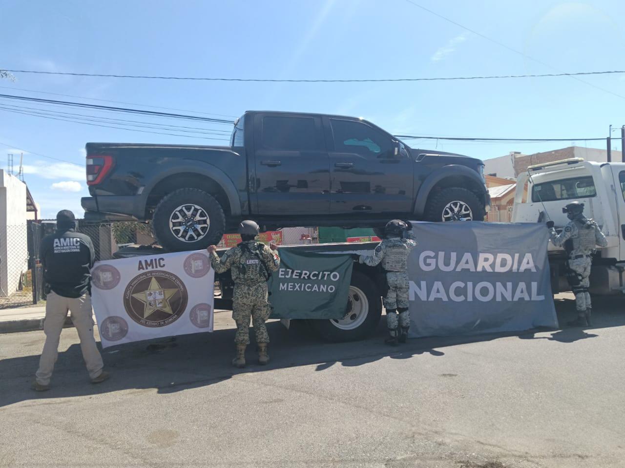 Personal de la Guardia Nacional Coordinación Sonora desplegados en el municipio de Caborca en el estado de Sonora con el apoyo de la FGE y el Ejército Mexicano lograron el aseguramiento de un vehículo con reporte de robo en los Estados Unidos, esto cuando el personal en patrullaje detectó una camioneta Pick-up que circulaba a alta velocidad y logró evadirse entra las calles de la mencionada ciudad, de esa manera dio inicio un despliegue de búsqueda apoyados con un dron y reconocimientos terrestres, a los minutos el vehículo fue localizado oculto en el patio trasero de una vivienda donde a simple vista se observaron cajas que contenían cartuchos para armas de fuego.