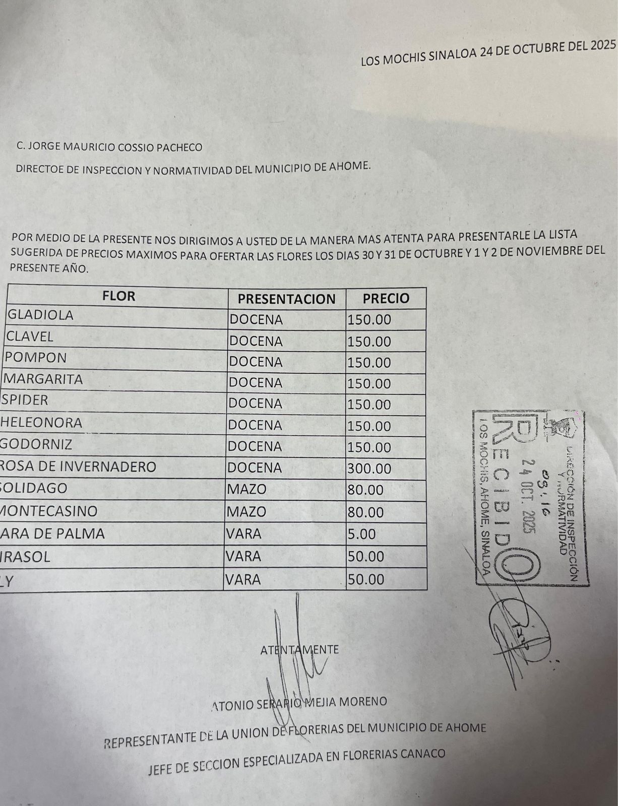 La lista oficial de precios la dio a conocer el director de Inspección y Normatividad del Municipio de Ahome, Jorge Mauricio Cosío Pacheco, quien destacó que las principales flores que se venden en estas fechas son la gladiola, pompón, clavel, rosa, entre otras variedades.