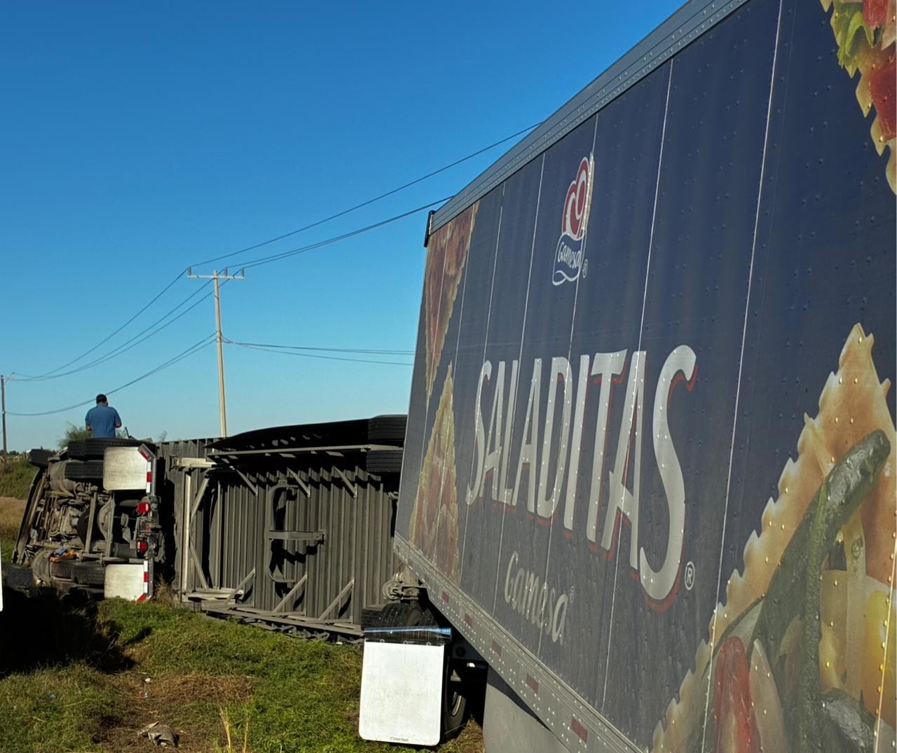 Los Mochis, Sin.- Un tráiler con doble semirremolque, propiedad de la empresa Gamesa, volcó esta madrugada mientras circulaba sobre la carretera internacional México 15, en el tramo comprendido entre Juan José Ríos y Los Mochis, a la altura del kilómetro 11, frente a la empresa Steelway Invernaderos. La unidad transportaba un cargamento de galletas con destino al estado de Sonora.