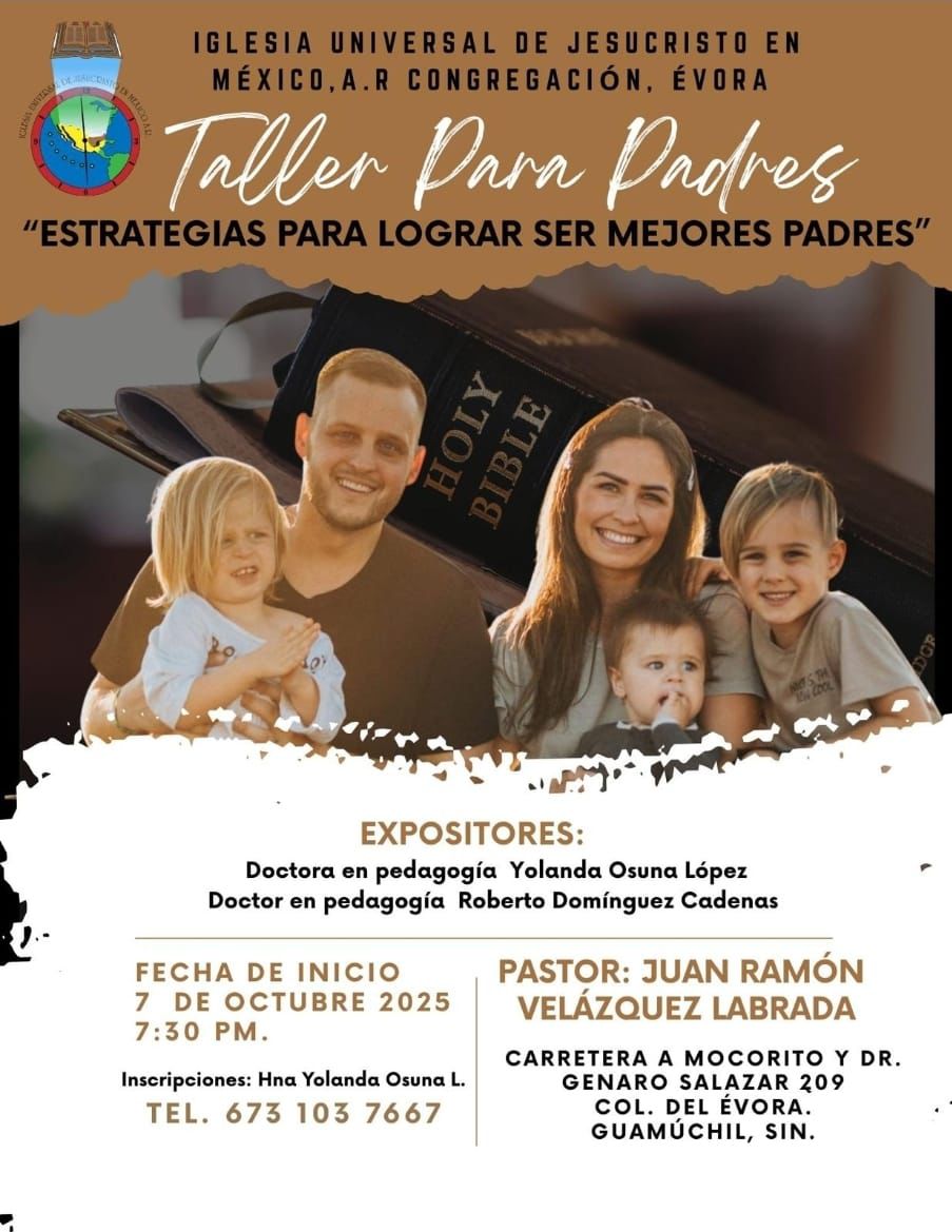 Guamúchil, Sin.- Juan Velázquez, pastor de la iglesia Universal de Jesucristo, informó que este día martes 7 de octubre, a las 7:30 de la tarde, en la iglesia Universal de Jesucristo realizará un taller para padres de familia, con el objetivo de mejorar la comunicación entre ellos y sus hijos, ya que es algo muy importante por los desafíos que se viven en la sociedad.