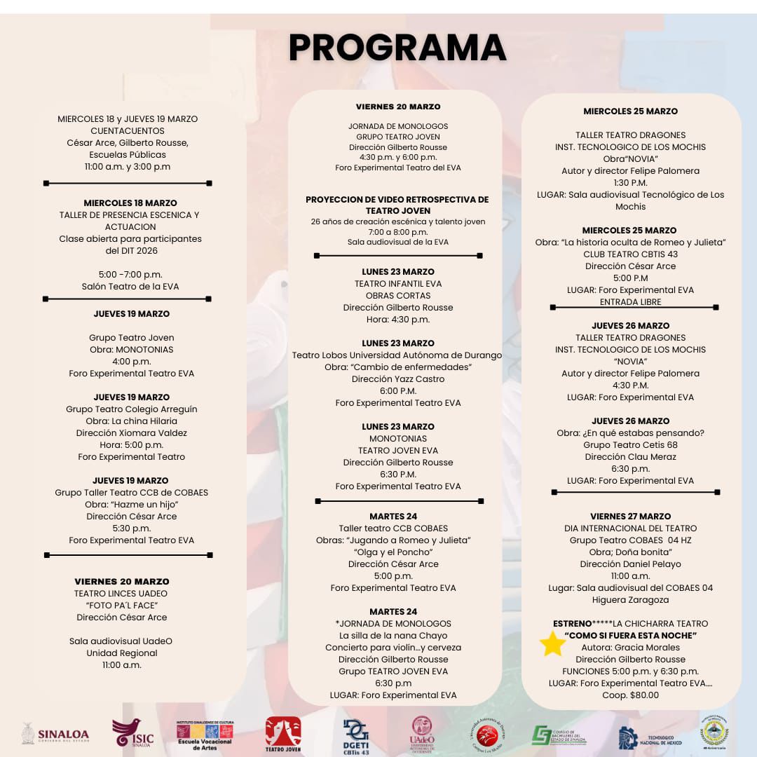 ‘’La programación la vamos a estar publicando en la página de la Escuela Vocacional de Artes, Teatro Joven, Instagram, Facebook, la mayoría son aquí en el foro experimental de teatro del 18 al 27 de marzo, algunas se realizan en la UAdeO, en el Tec, de tal manera que se encuentra con públicos cautivos’’.