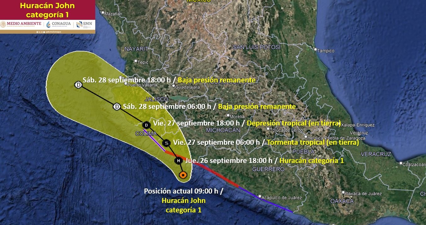 Ciudad de México.- John se mantiene como huracán categoría 1 en la escala Saffir-Simpson y se desplaza lentamente sobre el Pacífico central mexicano, con trayectoria hacia la costa central de Michoacán; a las 09:00 horas, tiempo del centro de México, se localizó aproximadamente a 75 kilómetros (km) al suroeste de Lázaro Cárdenas, Michoacán, y a 245 km al sureste de Manzanillo, Colima, con vientos máximos sostenidos de 120 km/h, rachas de 150 km/h y desplazamiento hacia el oeste-noroeste a 7 km/h.