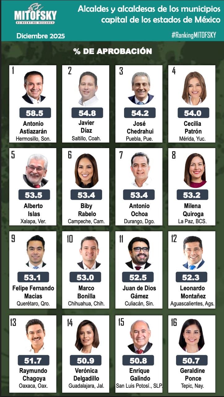 El presidente municipal de Culiacán, Sinaloa, apareció en el lugar 11 –de un ranking de 31— con un 52.5 por ciento de aprobación por parte de los ciudadanos entrevistados por la empresa encuestadora en diciembre de 2025.