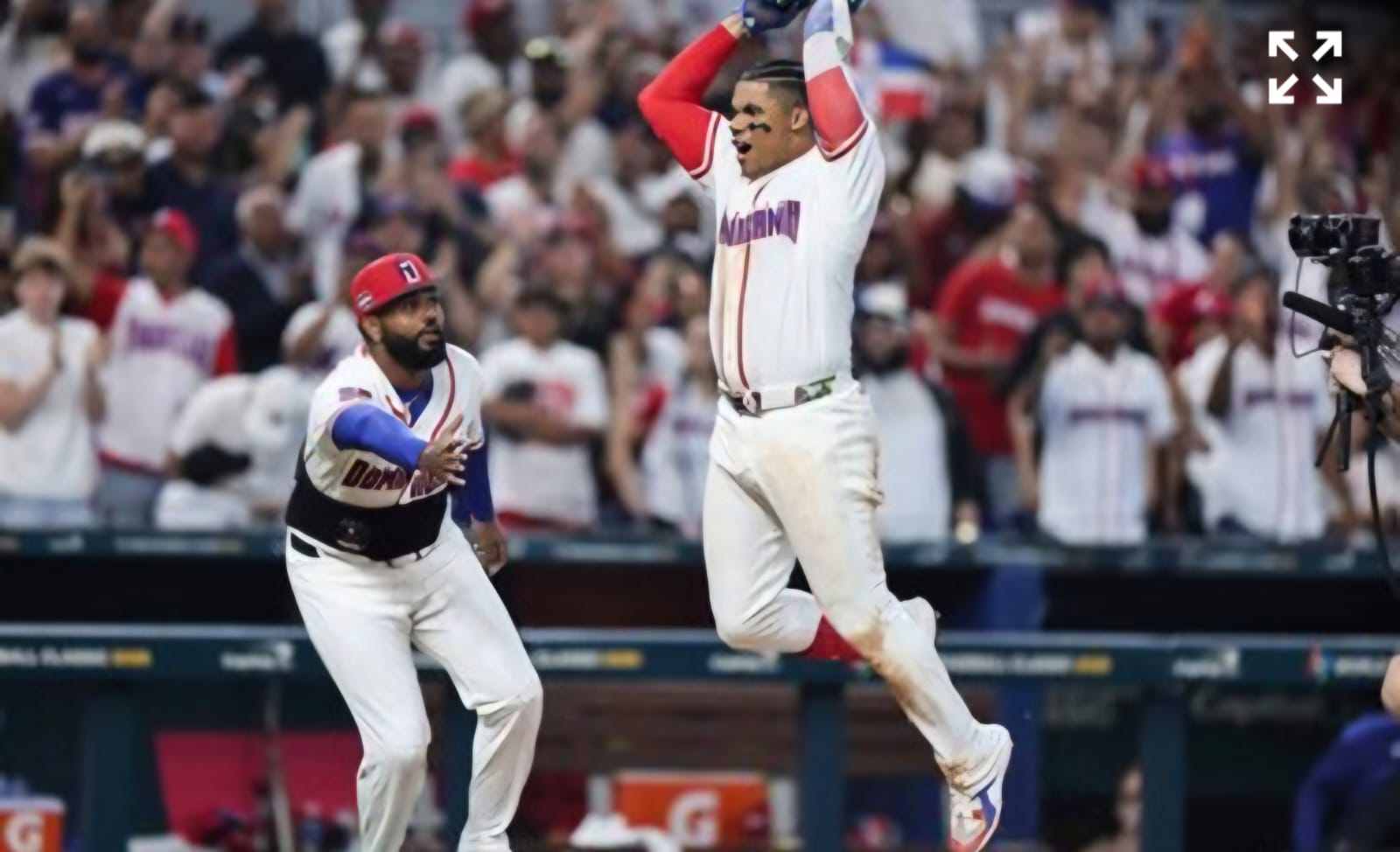 Guerrero conectó su primer jonrón del Clásico Mundial de Béisbol en la tercera entrada, desatando una escena de celebración entre el home y el dugout dominicano que incluyó múltiples rutinas de apretones de manos y una chaqueta y cadena de jonrones personalizadas.
