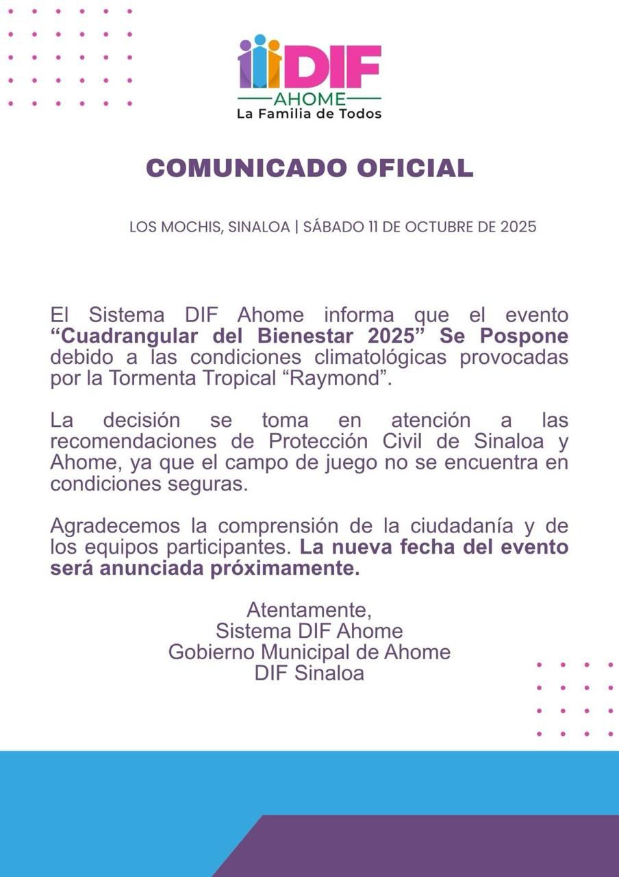 “El bienestar y la seguridad de los participantes y asistentes es prioridad”, señaló el DIF Ahome en su comunicado, donde además agradece la comprensión de la ciudadanía y de los equipos involucrados.