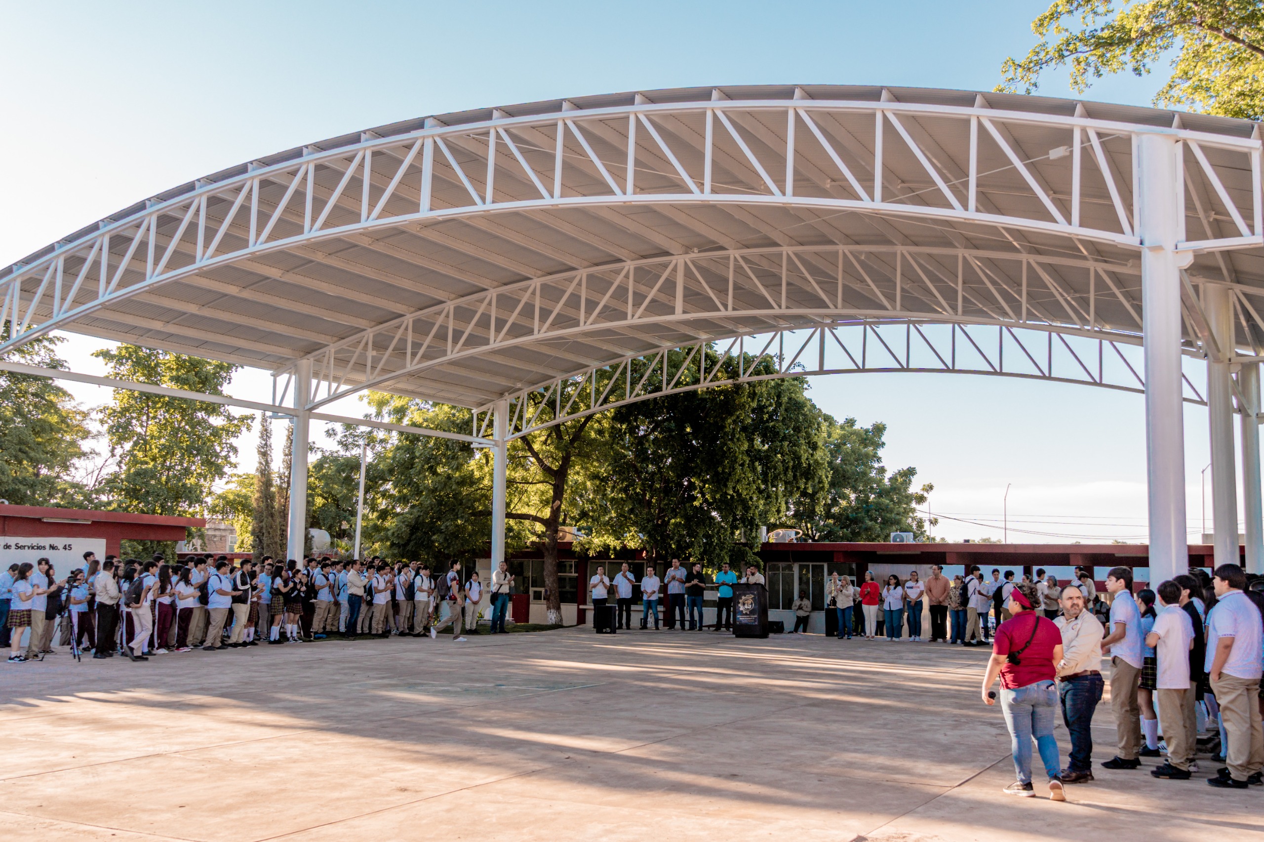 Guamúchil, Sin.- La presidenta municipal de Salvador Alvarado, Lupita López González, acompañó al personal directivo, docente y estudiantil del CBTIS No. 45 en la inauguración de la primera etapa de la techumbre de la institución, un proyecto que representa un avance significativo en la mejora de la infraestructura educativa.