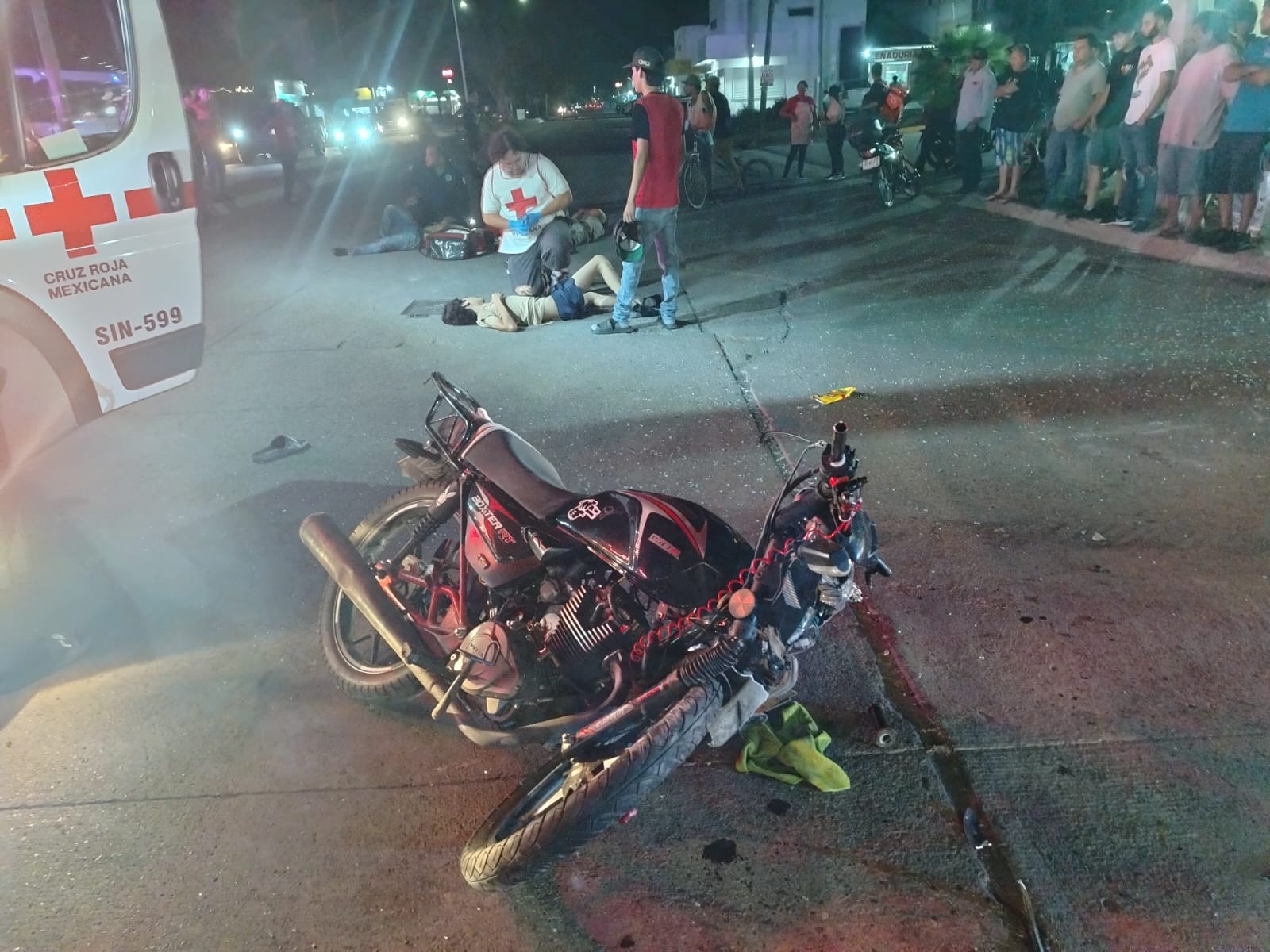 Los Mochis, Sin.– Un fuerte accidente se registró en el sector Haciendas del Valle, al poniente de Los Mochis, cuando tres jóvenes que viajaban en una motocicleta se impactaron contra un automóvil en el cruce de la calle Ayuntamiento y el bulevar Bicentenario.