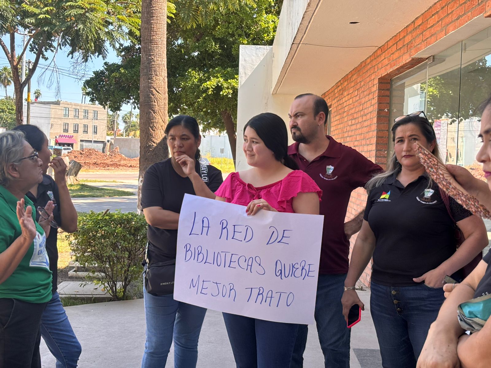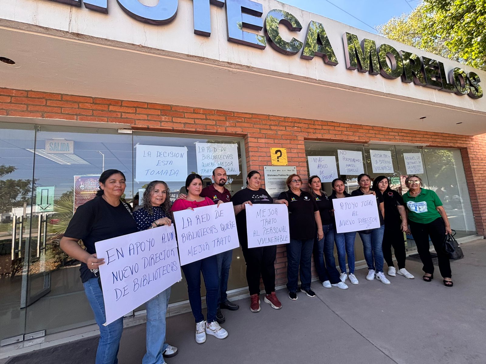 Los Mochis, Sin.- Este martes, trabajadores de la Red Municipal de Bibliotecas Públicas en Ahome se manifestaron en la Biblioteca Pública Morelos para exigir la expulsión definitiva de la exdirectora Celestina Cota Álvarez, quien fue removida de su cargo este pasado lunes por la Dirección del Instituto Municipal de Arte y Cultura para instalar al maestro Polo Infante como nuevo director de la red de bibliotecas.