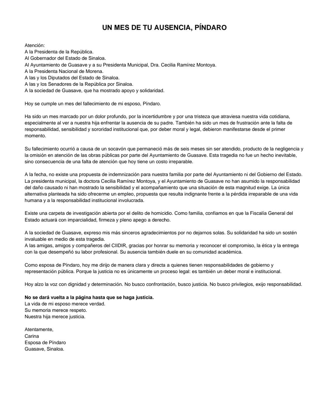 En el documento, Gámez Jiménez sostuvo que su exigencia no responde a confrontación alguna, sino a la búsqueda de verdad y responsabilidad.