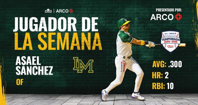 Guadalajara, Jal.- El jardinero de Cañeros de Los Mochis, Asael Sánchez, es el primer elemento en llevarse el reconocimiento a Jugador de la Semana presentado por ARCO, de