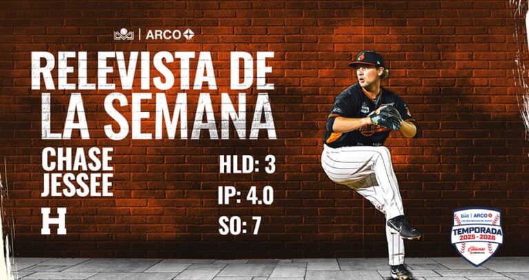 Guadalajara, Jal.- El relevista zurdo de los Naranjeros de Hermosillo, Chase Jesse, es el primer ganador a Relevista de la Semana, de la Temporada 2025-2026 presentada