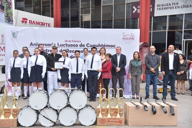 Los Mochis, Sin.- El Ayuntamiento de Ahome, a través de la Dirección de Educación, entregó reconocimientos y equipos de Banda de Guerra a las escuelas