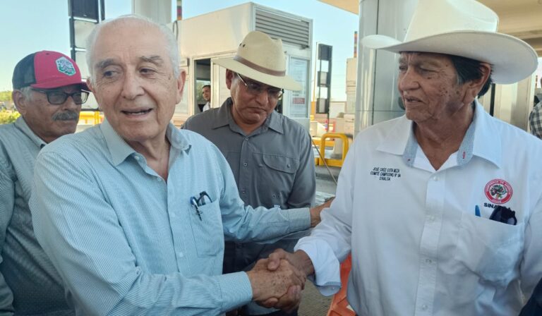 Guasave, Sin.- El delegado de SADER, Jesús Vega Acuña, acudió a la caseta de cobro de Cuatro Caminos para entrevistarse con los manifestantes que se