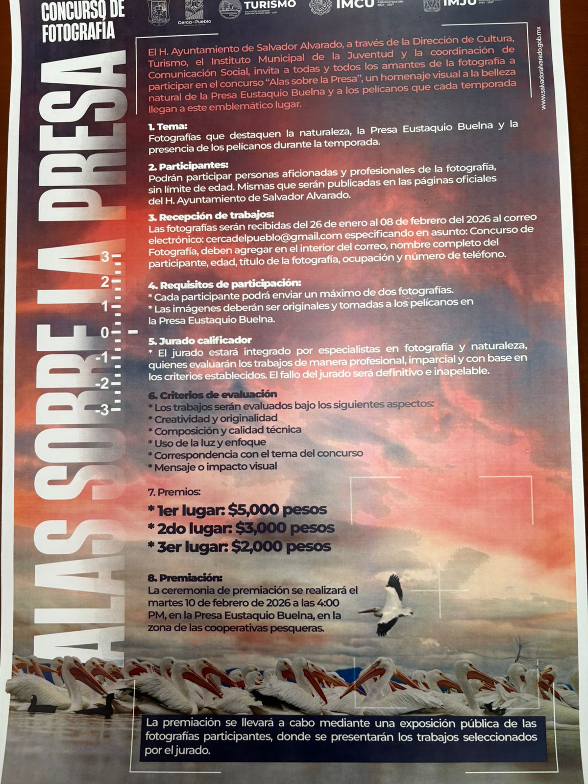 Enfatizó que los premios, se otorgarán 5 mil pesos al primer lugar, 3 mil pesos al segundo y 2 mil pesos al tercer lugar y la ceremonia de premiación se realizará el martes 10 de febrero de 2026 a las 4:00 de la tarde, en la Presa Eustaquio Buelna, en la zona de las cooperativas pesqueras, donde además se montará una exposición pública con las fotografías participantes.