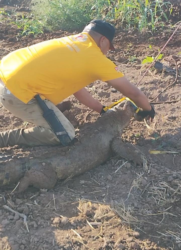 Juan José Ríos, Sin.- Esta mañana, alrededor de las 8:40 horas, elementos de Protección Civil de Juan José Ríos acudieron al reporte de un caimán que se encontraba en un canal de riego de una parcela.