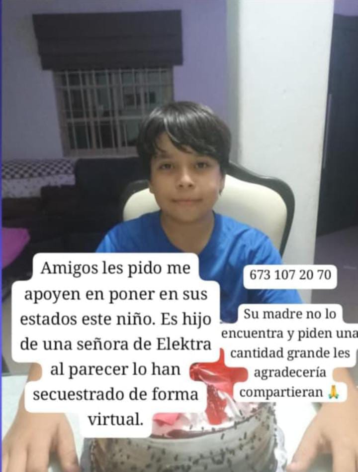 Familiares empezaron a recibir llamadas pidiendo dinero por lo que denunciaron a las autoridades competentes, sin embargo, solicitan la colaboración ciudadana para localizarlo y cualquier información pueden reportarla al número 673 100 53 49 de Beatriz Báez madre del menor.