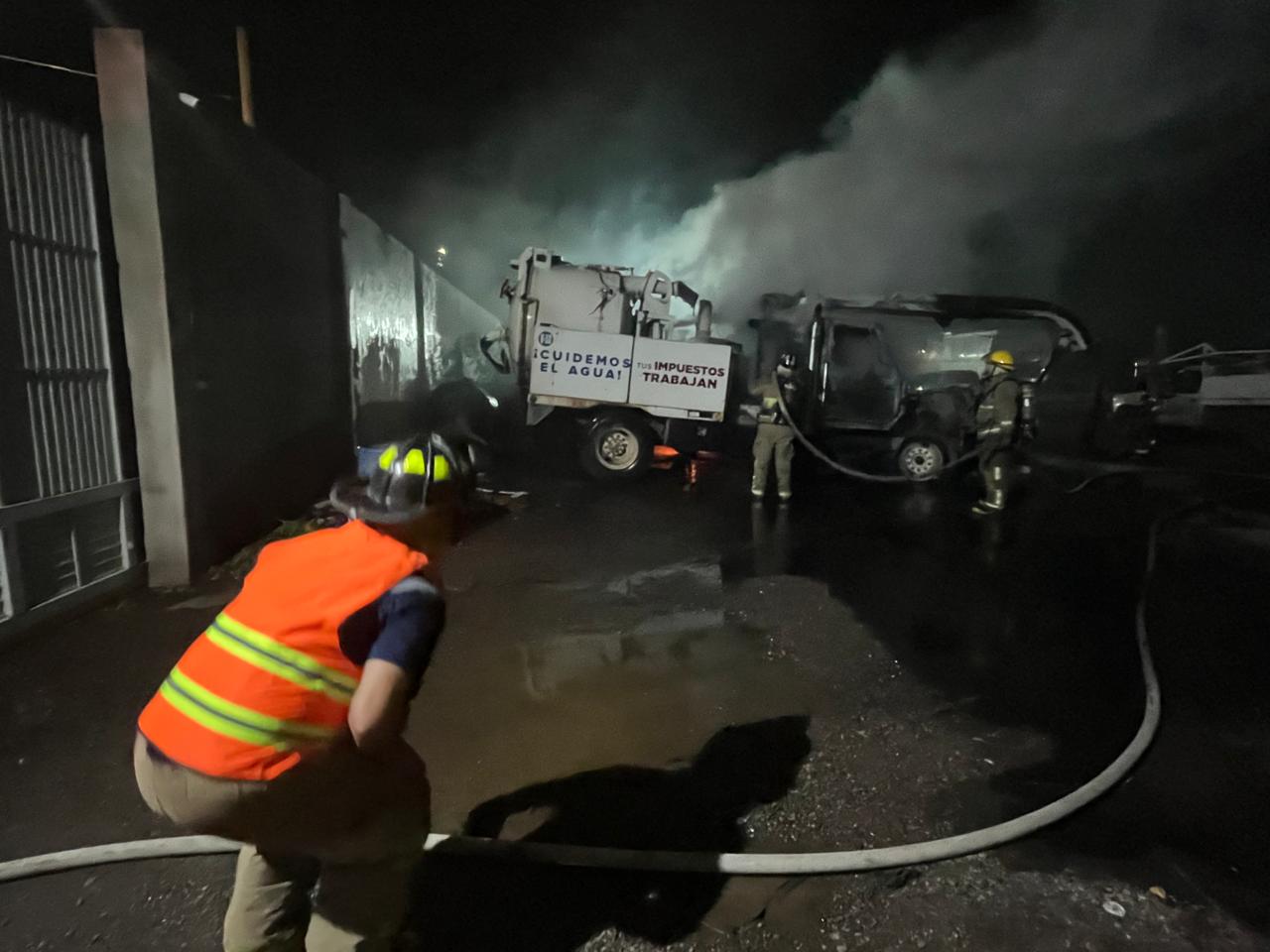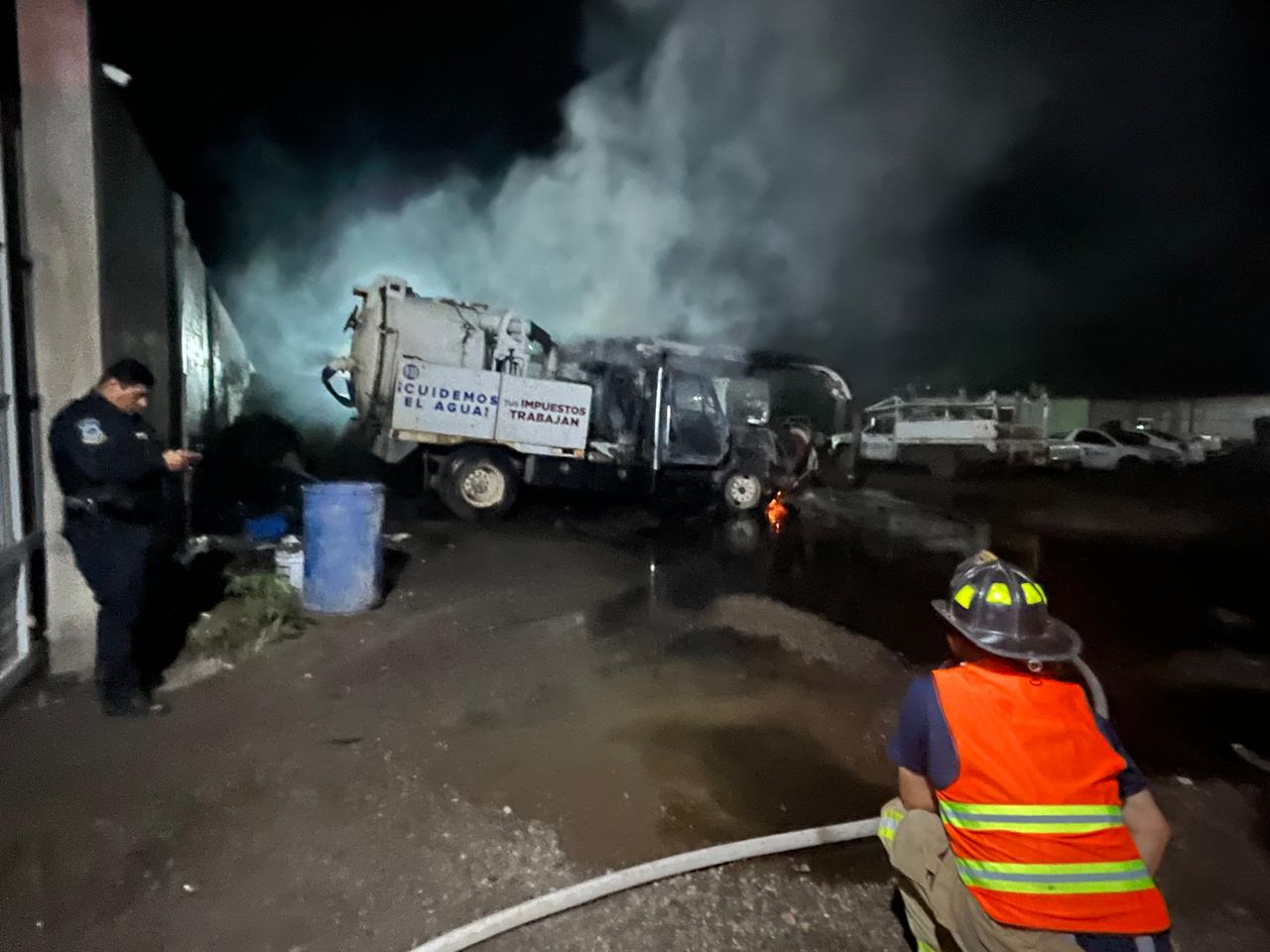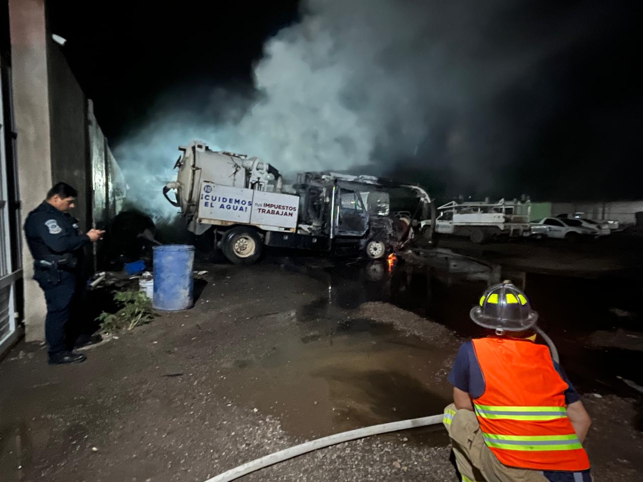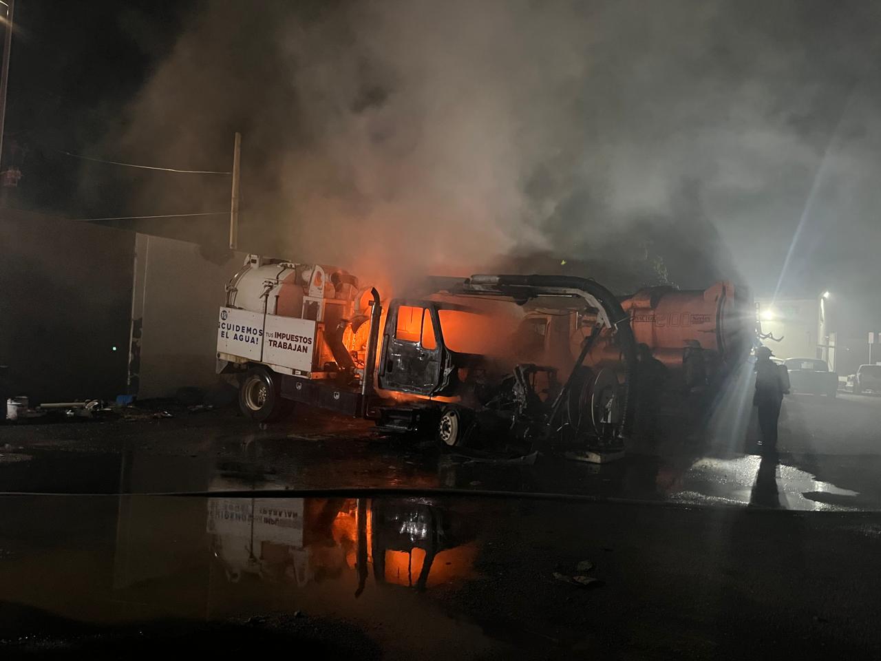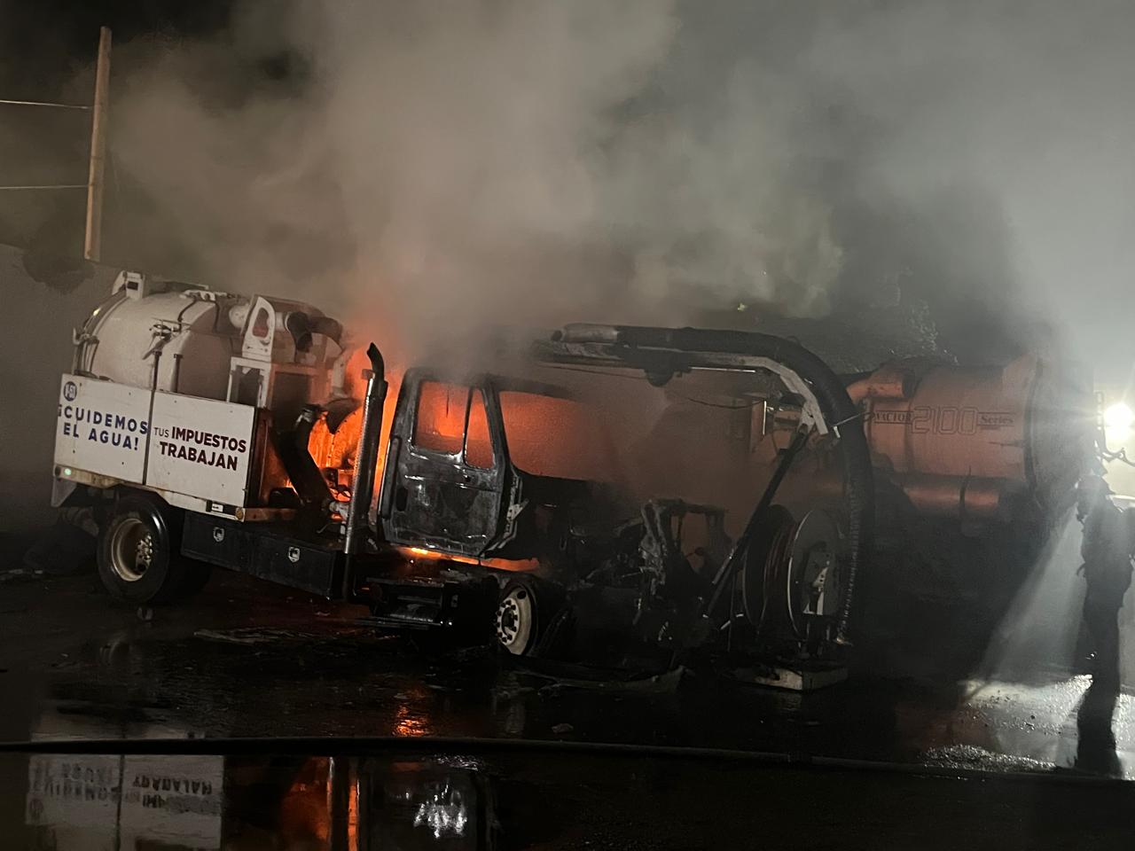 Guasave, Sin.- Un camión tipo vactor propiedad de la Junta Municipal de Agua Potable y Alcantarillado de Guasave quedó reducido en cenizas tras incendiarse durante la madrugada de este domingo, al interior de un inmueble perteneciente al Ayuntamiento.