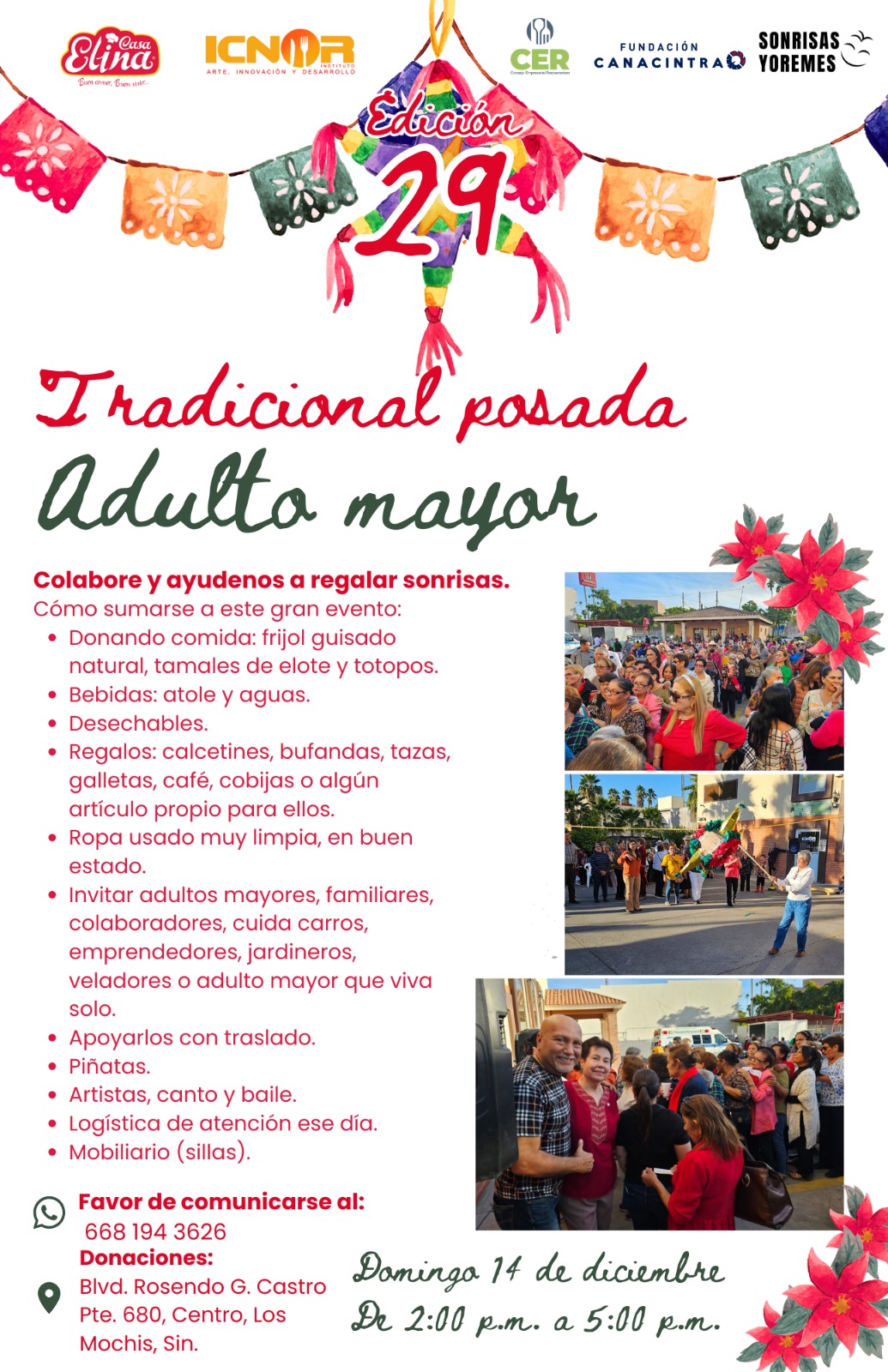 Los Mochis, Sin.- Con la finalidad de brindar unas horas de amor y alegría ya se empieza a preparar la tradicional Posada del Adulto Mayor, la cual se llevará a cabo el próximo domingo 14 de diciembre en estacionamiento de casa Elina ubicada por el bulevar Rosendo G. Castro en la colonia americana de Los Mochis.