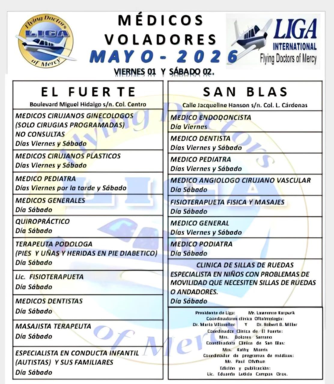 Los Mochis, Sin.- Programa de médicos a venir para el próximo mes de Mayo, los días Viernes 01 y Sábado 02.