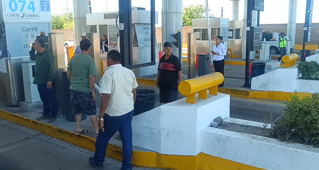 Guasave, Sin.- Productores agrícolas dan pase libre a los automovilistas en la caseta de cobro de Cuatro Caminos; poco antes de las 10:30 de la mañana los hombres del campo decidieron levantar las plumas en el punto mencionado.