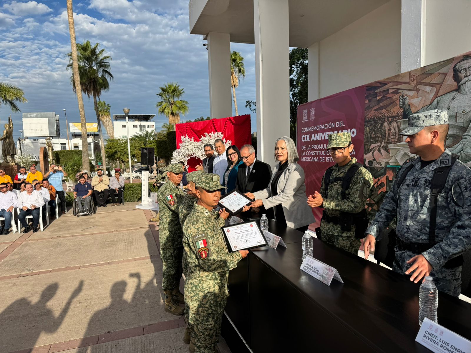 Guamúchil, Sin.- La mañana de este jueves 05 de febrero se llevó a cabo en el municipio de Salvador Alvarado un acto cívico, el cual estuvo encabezado por las autoridades municipales, diputado local del 09 distrito y fuerzas de seguridad federales y municipales, para conmemorar el CIX aniversario de la promulgación de la Constitución Política Mexicana llevada a cabo en el año de 1917 por Venustiano Carranza
