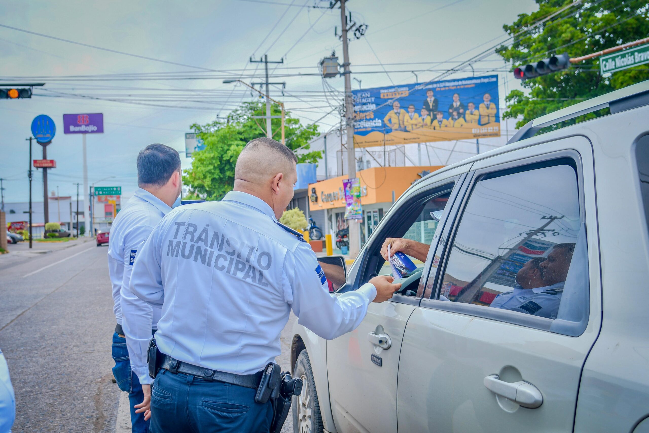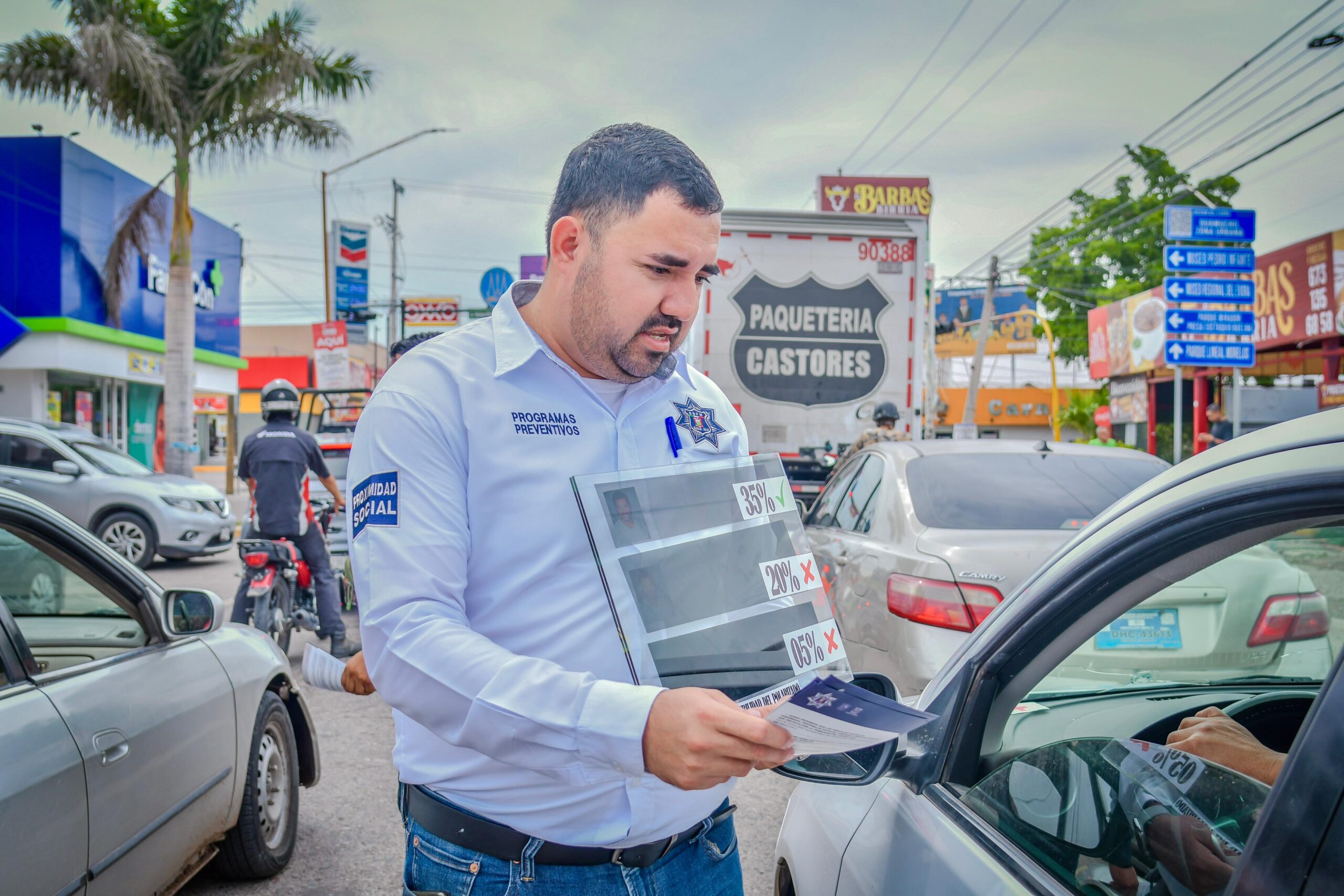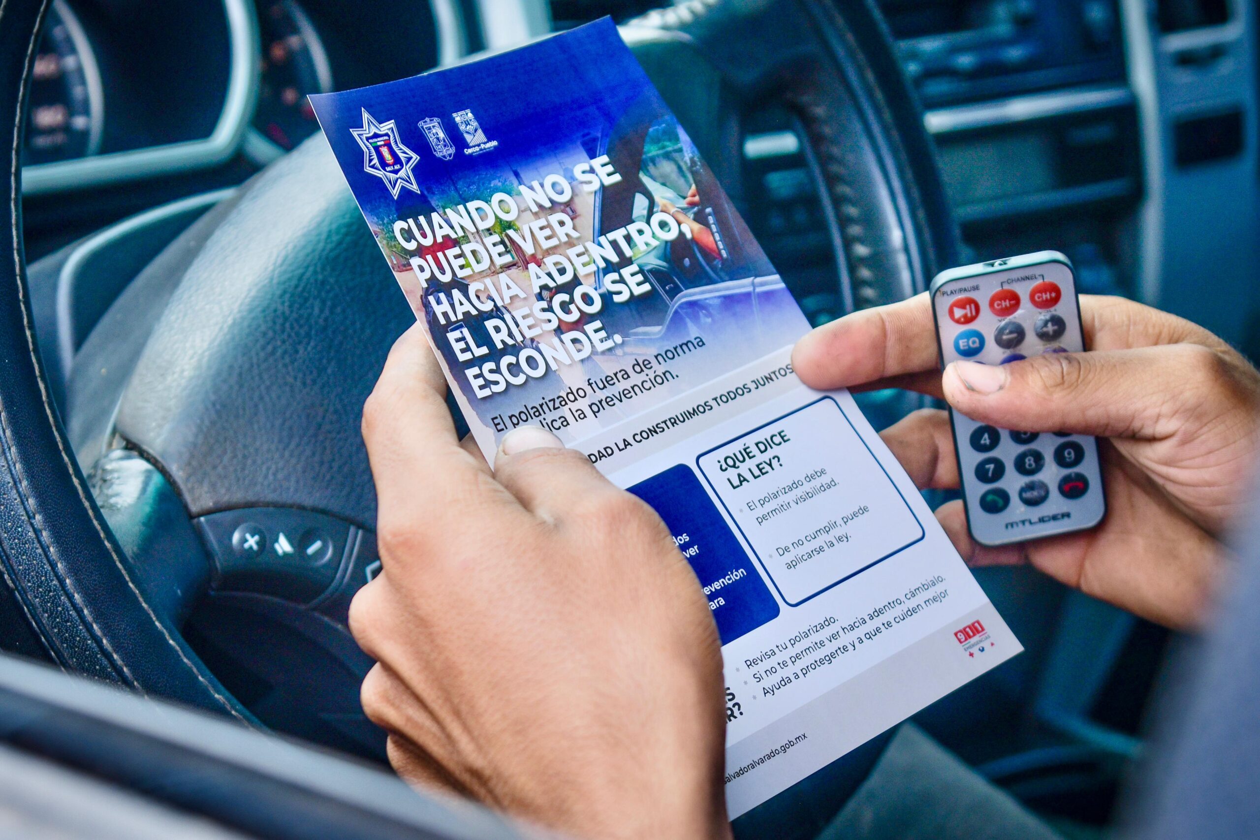 En el crucero de las avenidas Mariano Matamoros y Nicolás Bravo, personal de la dependencia entregó volantes e informó directamente a los automovilistas sobre la importancia de contar con un polarizado que permita la visibilidad al interior del vehículo, como medida preventiva para la seguridad de conductores y pasajeros.