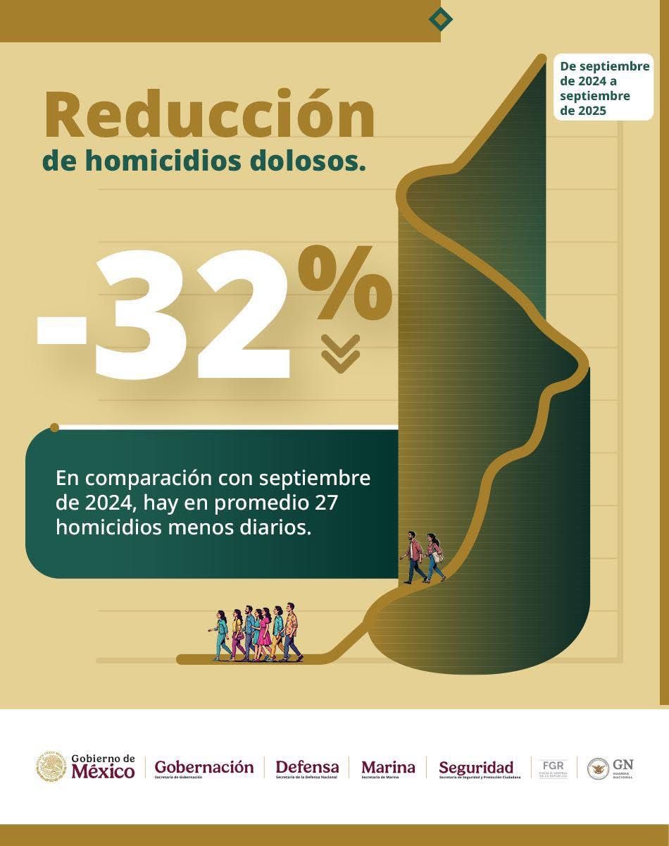 Hemos observado una reducción del 32 por ciento en el promedio diario de homicidios dolosos en el país, 27 homicidios menos que el septiembre del 2024. Es el septiembre más bajo en los últimos 10 años.