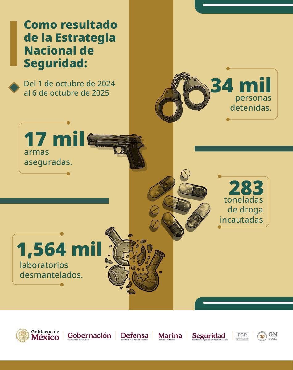 Se han aseguraron 283 toneladas de droga, más de 3 millones de pastillas de fentanilo. En 22 estados de la república han destruido más de 1 mil 500 laboratorios para la elaboración de metafentaminas.