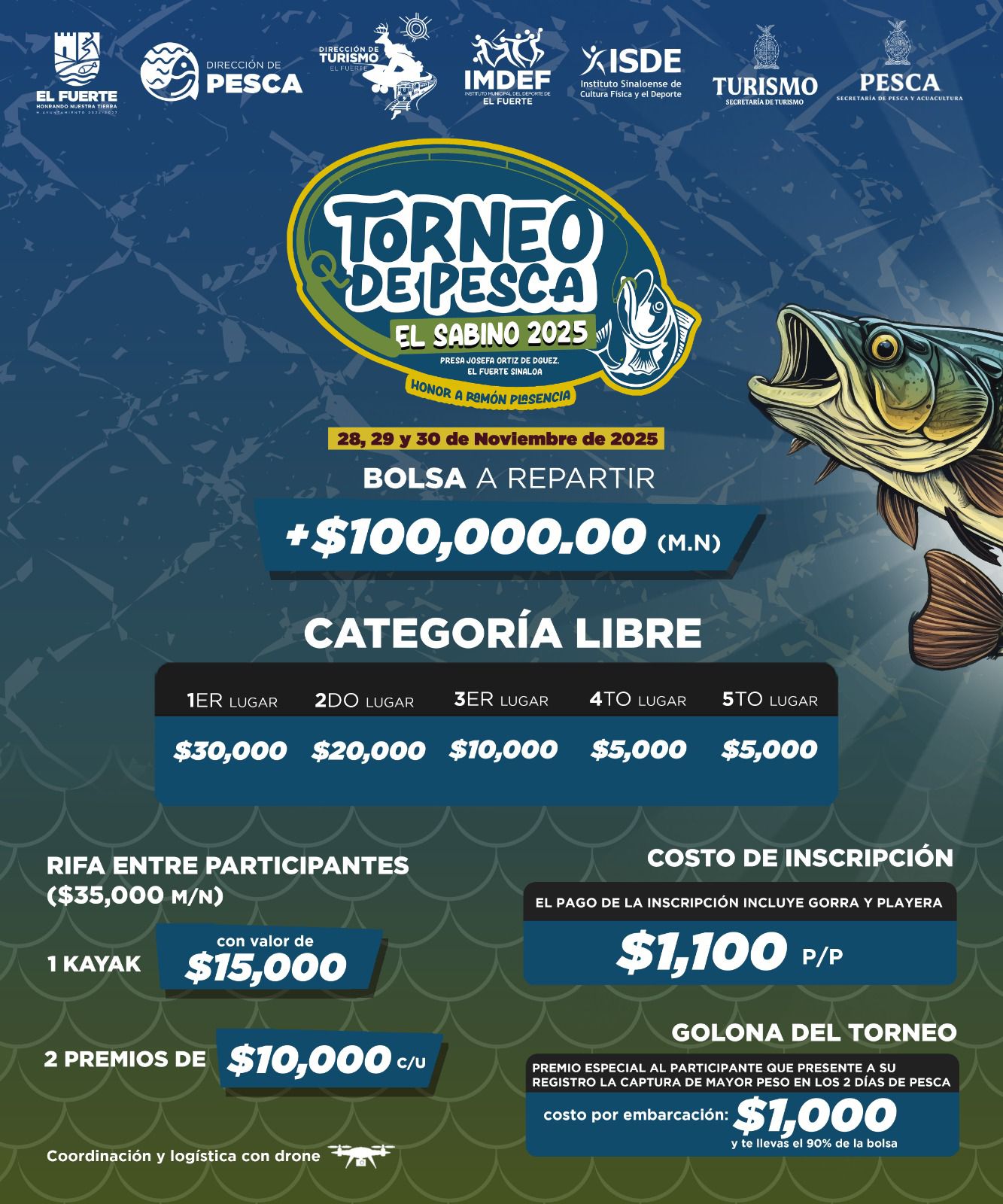 El costo de inscripción es de $1,100 pesos, que incluye una gorra y jersey oficial del evento. La convocatoria está abierta a todos los aficionados a la pesca deportiva que deseen disfrutar de un fin de semana de convivencia, naturaleza y competencia sana, bajo la modalidad de pesca y libera.