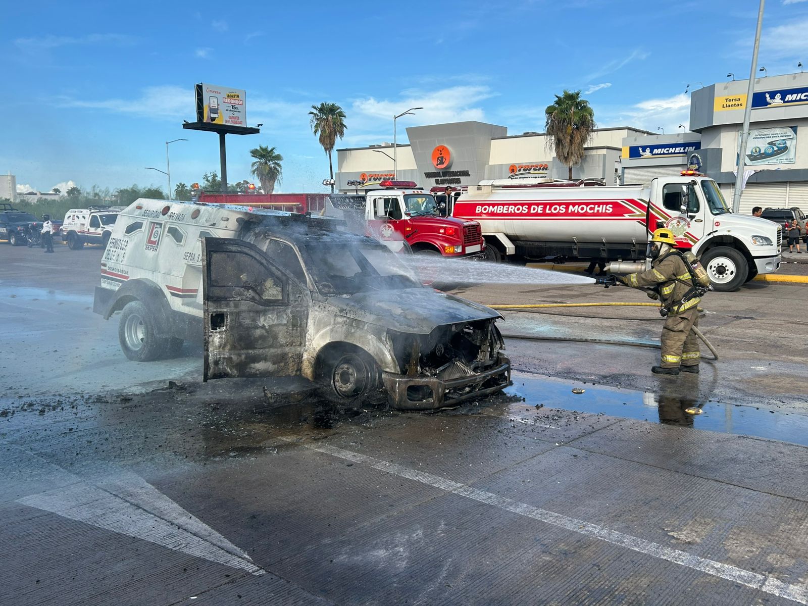 Personal de Protección Civil del Estado fue el primero en llegar al lugar, logrando controlar parcialmente el fuego con extintores y evitando que las municiones dentro de la unidad explotaran. Minutos después, elementos del cuerpo de bomberos de Los Mochis acudieron con equipo especializado para sofocar el incendio por completo.