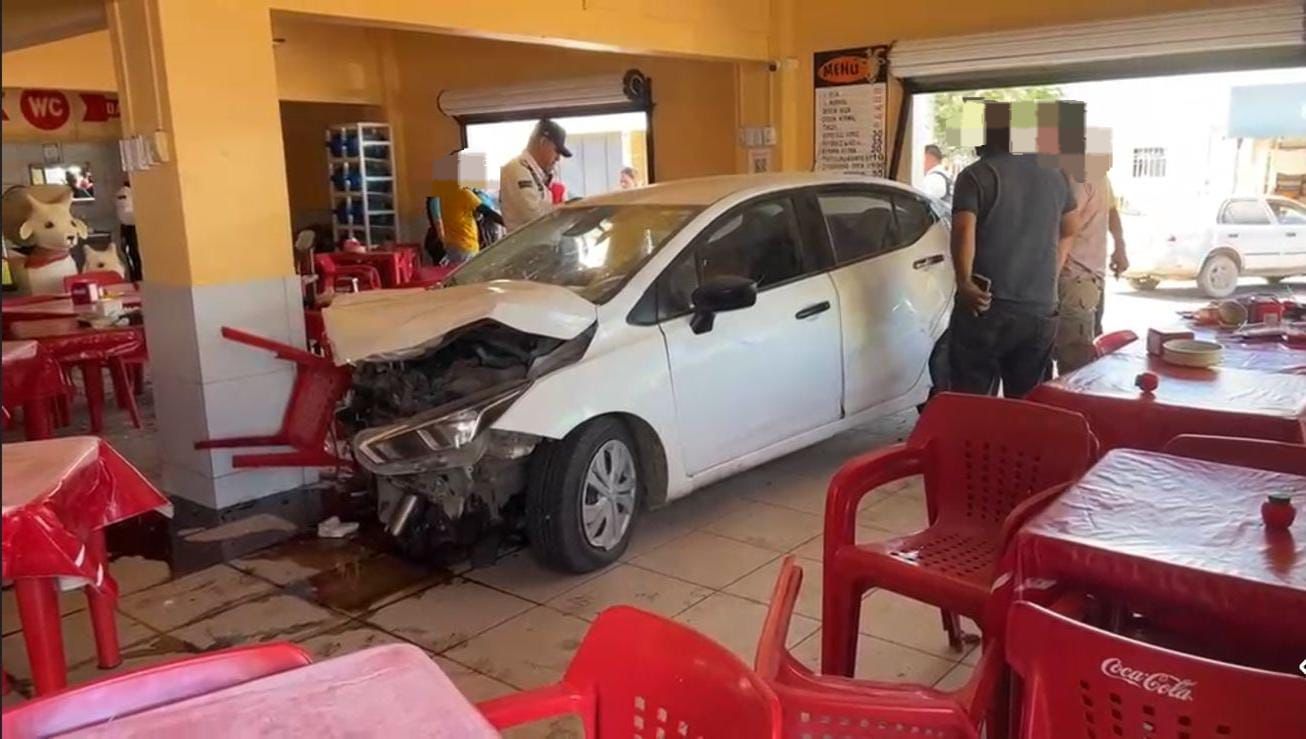 Guasave, Sin.- Un aparatoso accidente de tránsito cimbró la mañana de este viernes a vecinos y comensales de la colonia Ejidal, luego de que dos vehículos protagonizaran un violento encontronazo que dejó a una mujer proyectada fuera del automóvil y a la otra unidad incrustada dentro de un negocio de comida, además de cinco personas lesionadas, entre ellas dos menores de edad.