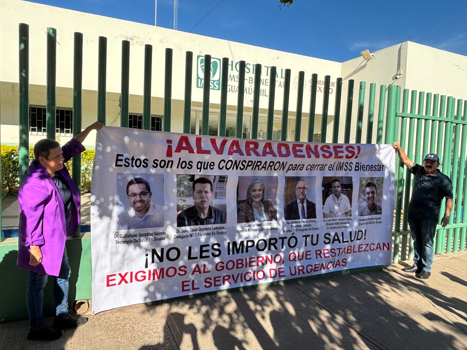 Guamúchil, Sin.- Jesús Alfredo Gaxiola Camacho, en compañía de la regidora Iliana Karina Moraga Inzunza y Socorro Astorga, colocaron una manta en la cerca perimetral del clausurado hospital IMSS-Bienestar de Guamúchil, donde señalan a funcionarios municipales y estatales como los culpables de haber dejado sin el servicio de urgencias al municipio de Salvador Alvarado.