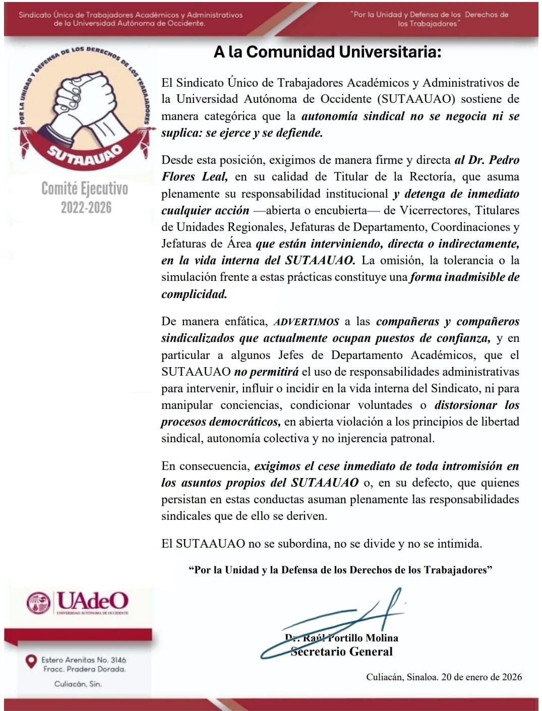 Culiacán, Sinaloa.- El Sindicato Único de Trabajadores Académicos y Administrativos de la Universidad Autónoma de Occidente (SUTAAUAO) exigió de manera firme al rector de la institución, Pedro Flores Leal, que cese de inmediato cualquier tipo de intervención en los asuntos y decisiones internas de la organización sindical.