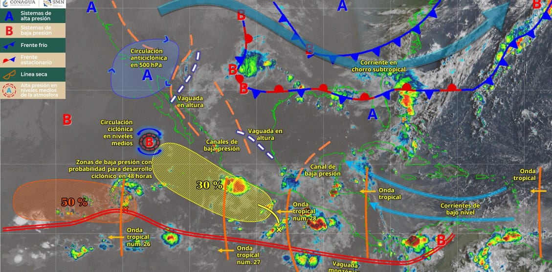 Lo mencionado se originará debido al monzón mexicano, una vaguada en niveles medios de la atmósfera sobre el noroeste del país, inestabilidad atmosférica, un canal de baja presión sobre el interior de la República Mexicana, una vaguada en altura, el desplazamiento de la onda tropical núm. 27 sobre el occidente del territorio nacional, la onda tropical núm. 28, una zona de baja presión con probabilidad para desarrollo ciclónico y otro canal de baja presión en el sureste mexicano.
