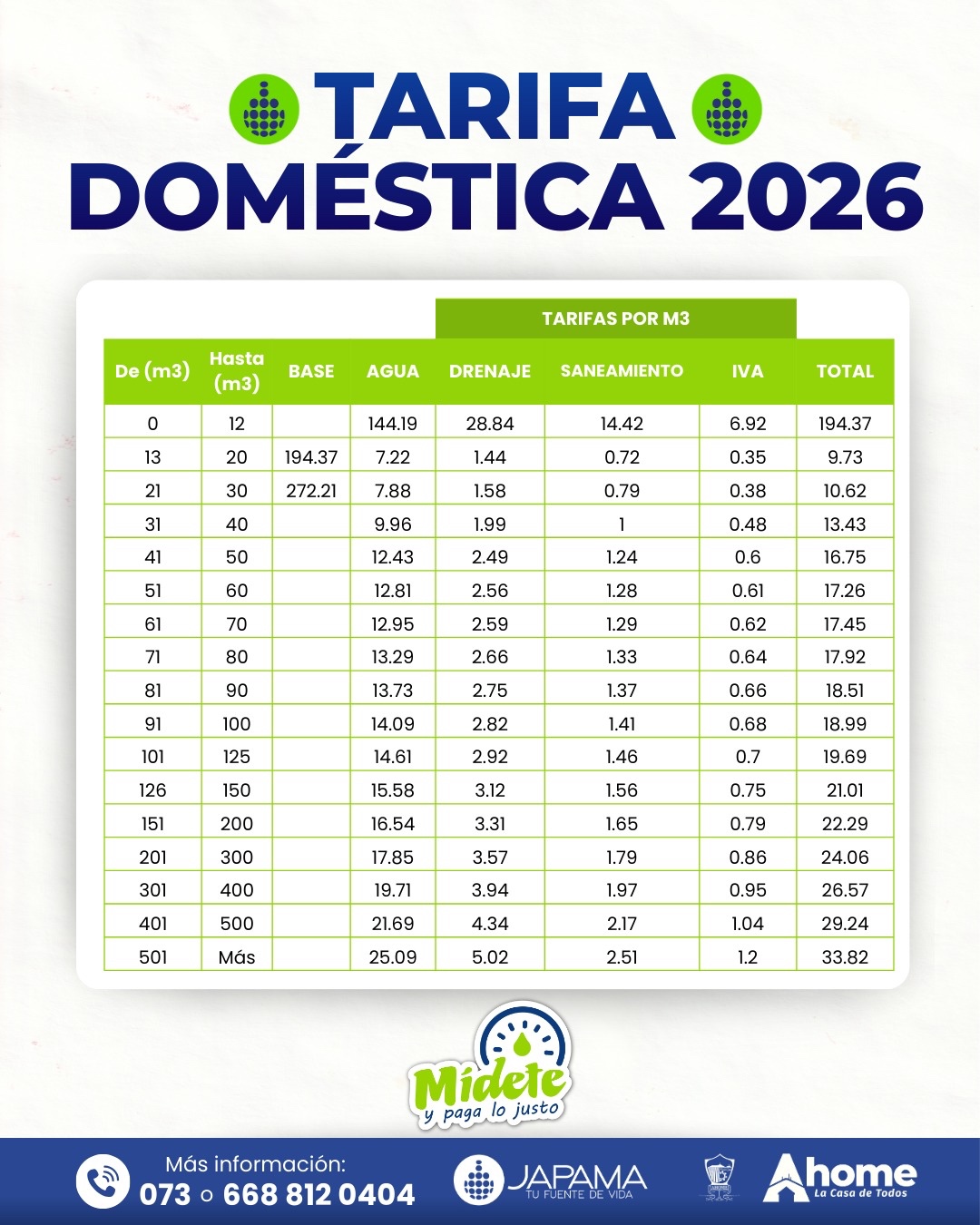 La indexación 2026 representa un aumento en el bloque de 12 metros cúbicos de 187 a 194 pesos; es decir, un incremento aproximado de 7 pesos en el recibo del agua por el consumo mínimo, de acuerdo a lo que explicó el gerente comercial de la Japama, Randy Ross Álvarez.