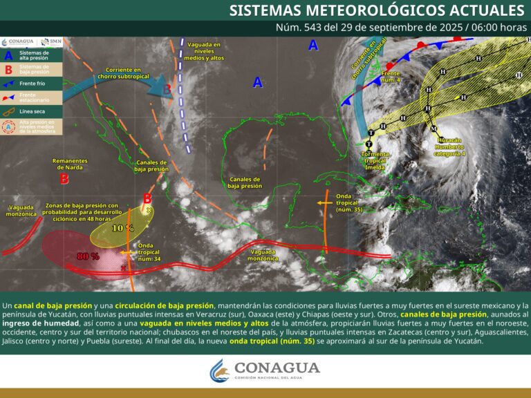 Ciudad de México.- Este día, el monzón mexicano e inestabilidad atmosférica mantendrán condiciones para originar chubascos y lluvias fuertes en la península de Baja California, Sonora, Chihuahua, Durango,