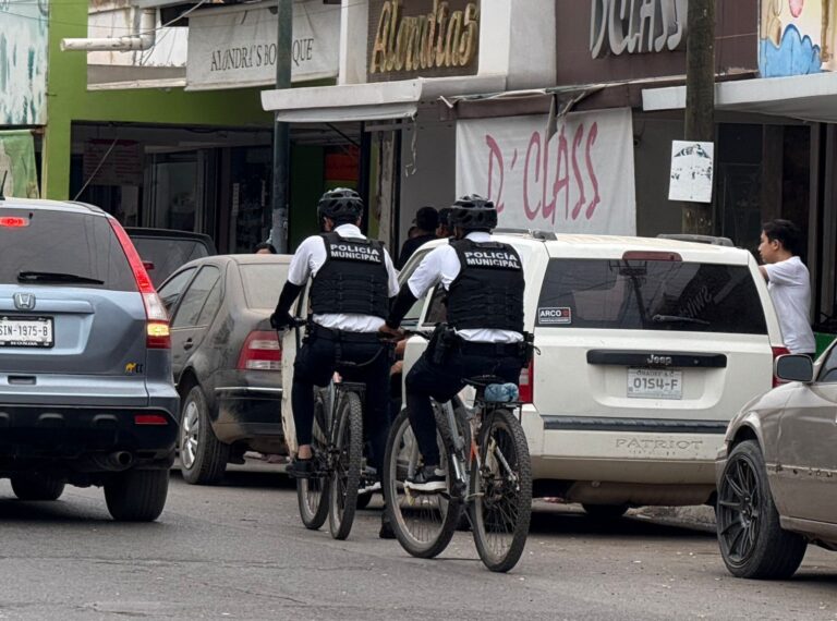 Policías en bicicleta vigilan el primer cuadro de la ciudad en Guasave
