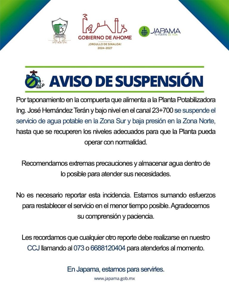 Los Mochis, Sin.- Por taponamiento en la compuerta que alimenta la Ingeniero José Hernández Terán, y bajos niveles de agua se suspende servicio de agua