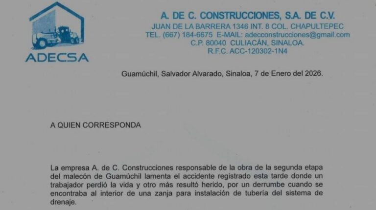 Constructora emite comunicado y lamenta muerte de trabajador en la obra del malecón de Guamúchil