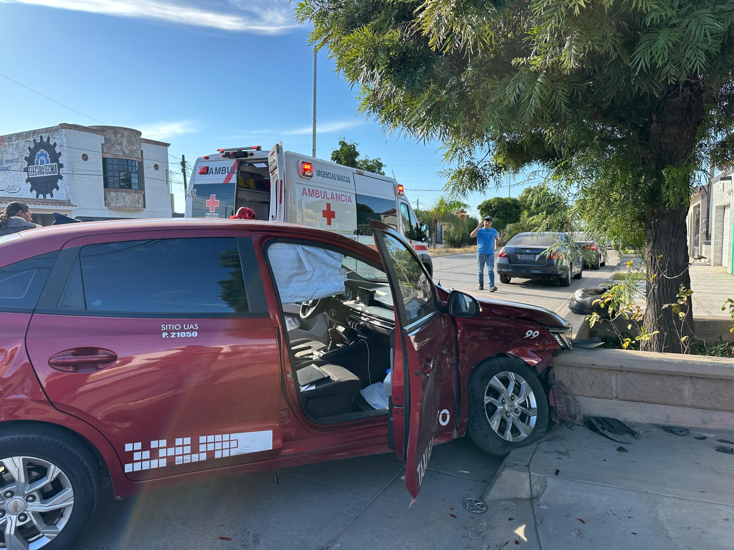 Los Mochis, Sin.– Un aparatoso accidente registrado la tarde de este viernes 14 de diciembre en el fraccionamiento Álamos Country dejó como saldo dos personas lesionadas y cuantiosos daños materiales, luego de que un taxi ejecutivo se pasara un alto y provocara una colisión con otro vehículo. El impacto proyectó ambas unidades contra un macetero y la fachada de una vivienda.