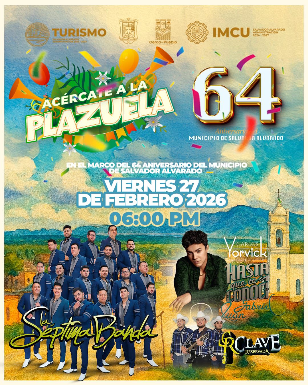 La alcaldesa alvaradense, expresó que, la fiesta continuará durante la tarde y noche del mismo viernes 27 de febrero en la plazuela municipal Pedro Infante en la ciudad de Guamúchil, donde amenizará el evento la Séptima Banda y el Grupo Clave Reservada, los cuales prometen poner un buen ambiente para hacer bailar y cantar a las miles de personas que se esperan que asistan al festejo, el cual se une al programa “Acércate a la Plazuela”.