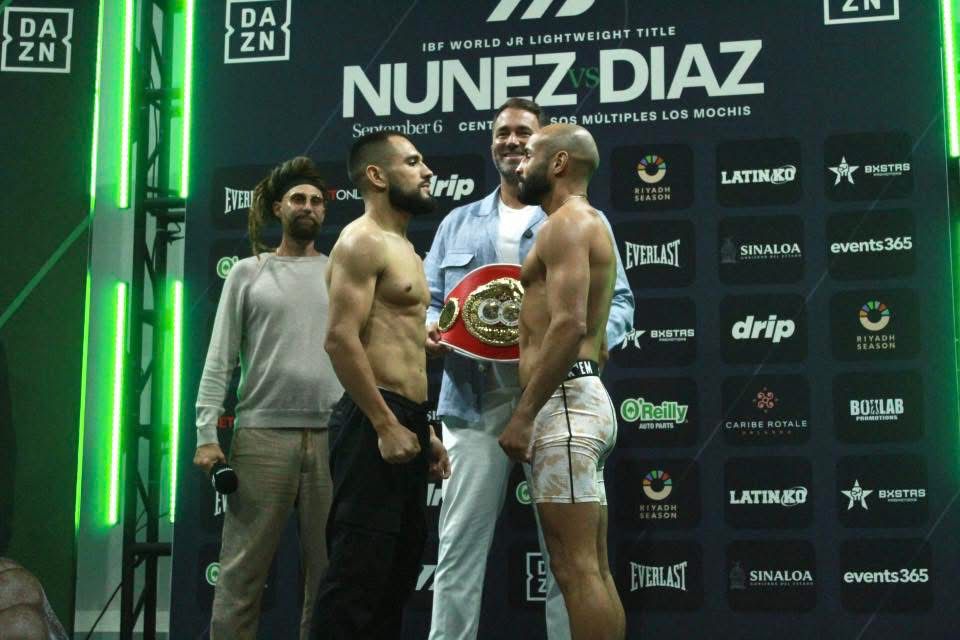 Los Mochis, Sin. Este viernes, el Centro de Innovación y Educación (CIE) fue testigo del pesaje oficial del campeón mundial superpluma de la FIB. El sinaloense Eduardo “Sugar” Núñez, y el retador puertorriqueño Christopher “Pitufo” Díaz, cumplieron con el peso para subir al ring este sábado 6 de septiembre en el Centro de Usos Múltiples (CUM) de Los Mochis.