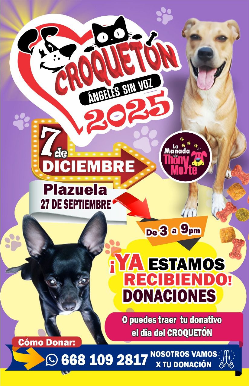 Los Mochis, Sin.- La Asociación Thony Moyte, en colaboración con defensores animalistas hacen la invitación al público en general para participar en la tercera edición del “Croquetón 2025” para entregarlos a perritos vulnerables o en situación de calle, una colecta que se llevará a cabo el día 07 de diciembre en el kiosko de la Plazuela 27 de Septiembre, a partir de las 3 de la tarde.