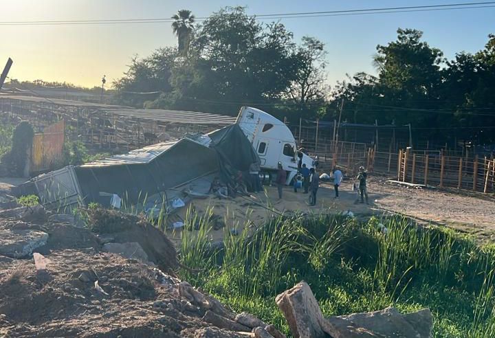 Guasave, Sin.- Un aparatoso accidente se registró la tarde del miércoles 25 de febrero, cuando un tractocamión cargado de frijol sufrió una salida de camino y cayó al interior de un dren, generando movilización de corporaciones de seguridad, aunque sin víctimas que lamentar.
