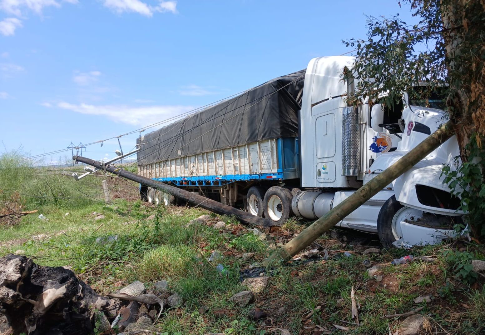 Guasave, Sin.- Cuantiosos daños materiales dejó un accidente sobre la carretera México-15 luego de que el chofer de un tráiler perdiera el control de la pesada unidad y terminara saliéndose de la rúa federal, derribando postes a su paso y terminara chocando contra un gran árbol.