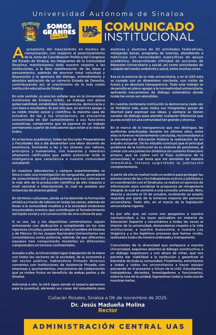 En el documento firmado por el rector Jesús Madueña Molina, la casa de estudios subraya que trabaja con plena gobernabilidad, estabilidad y apego a la legalidad, asegurando que su quehacer académico, científico y social se rige por resultados y está “a la vista de todos”.