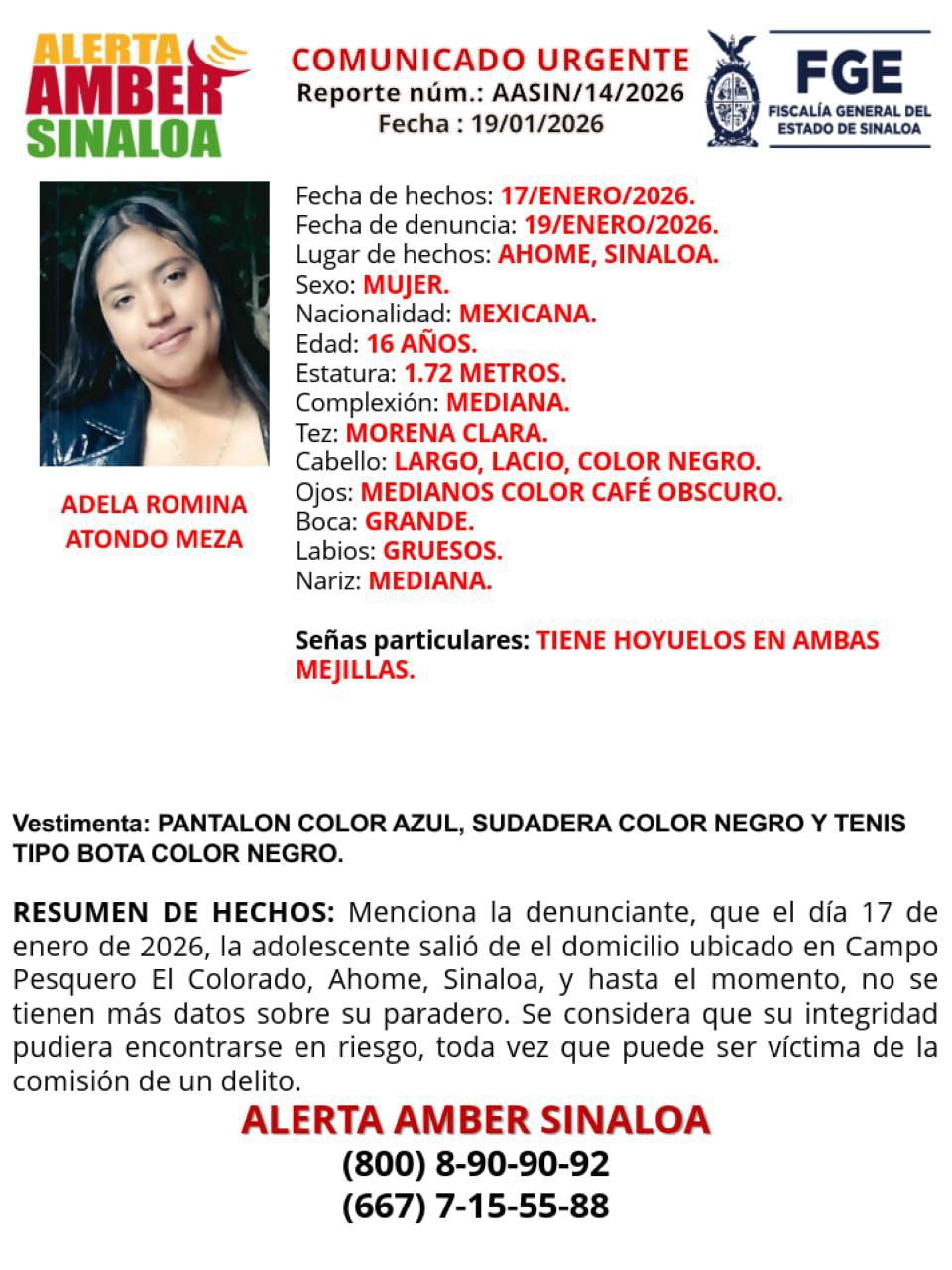 Los Mochis, Sin. – La Vicefiscalía Regional Zona Norte investiga como ausencia la desaparición de la joven de 16 años de edad Adela Romina Atondo Meza, de quien se desconoce su paradero desde el pasado sábado 17 de enero cuando salió de su domicilio ubicado en el campo pesquero El Colorado.