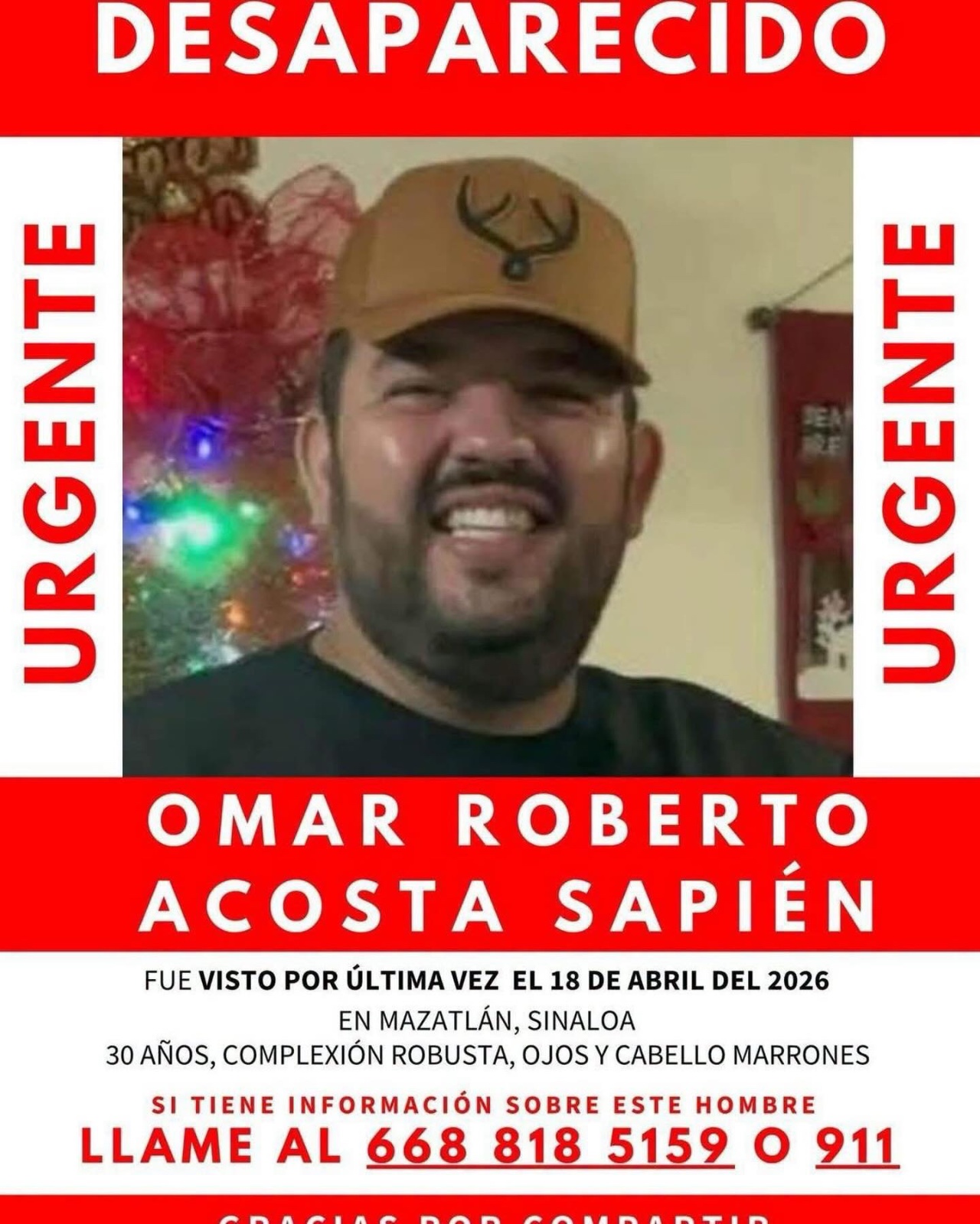 Cualquier información que colabore a la localización de Omar Roberto Acosta Sapién se puede reportar a los números telefónicos: 668 818 5152 o al número de emergencias 911.