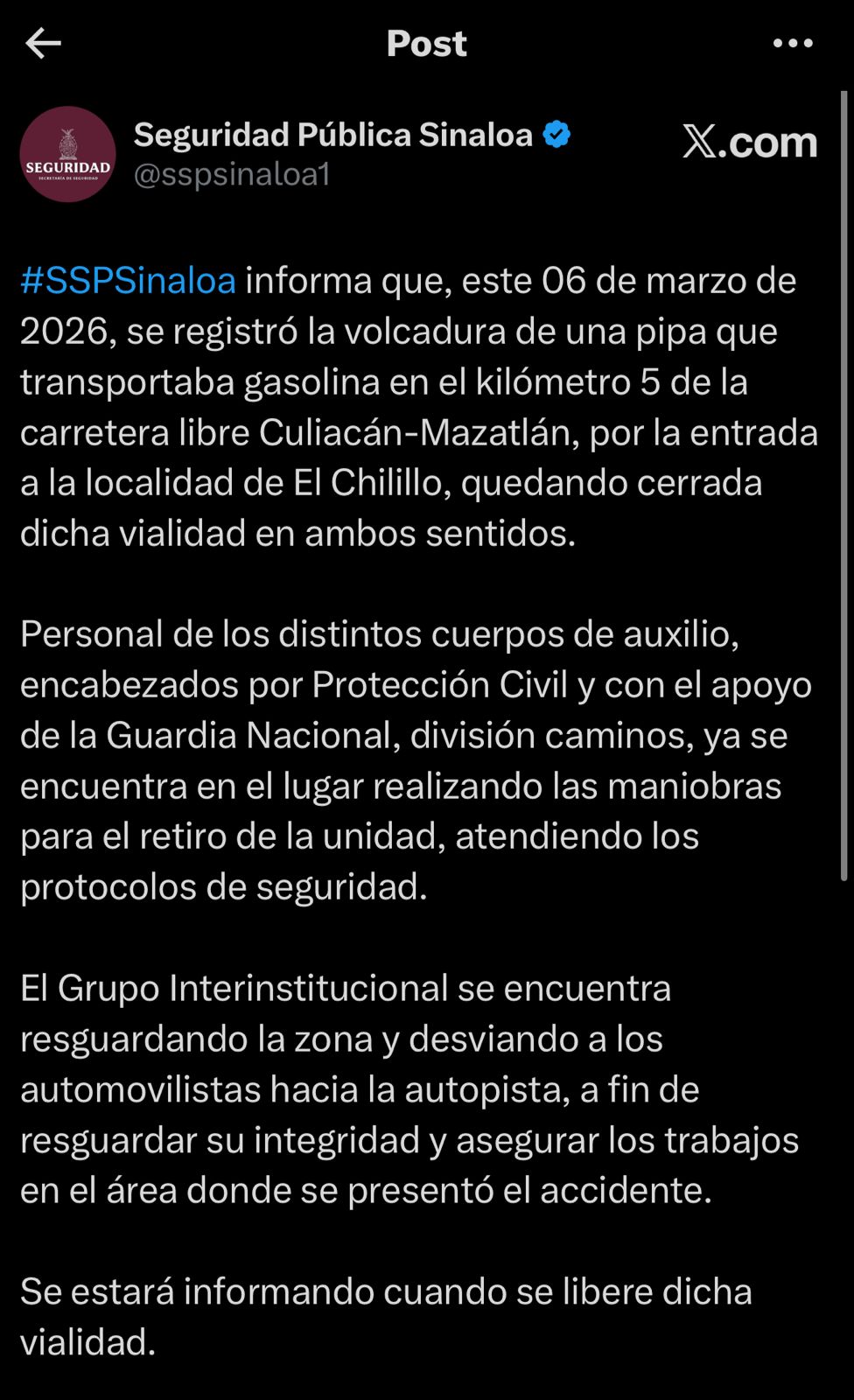 Culiacán, Sin.- Secretaría de Seguridad Pública de Sinaloa informó que este 6 de marzo de 2026 se registró la volcadura de una pipa que transportaba gasolina en el kilómetro 5 de la carretera libre entre Culiacán y Mazatlán, a la altura de la entrada a la localidad de El Chilillo, lo que provocó el cierre total de la vialidad en ambos sentidos.