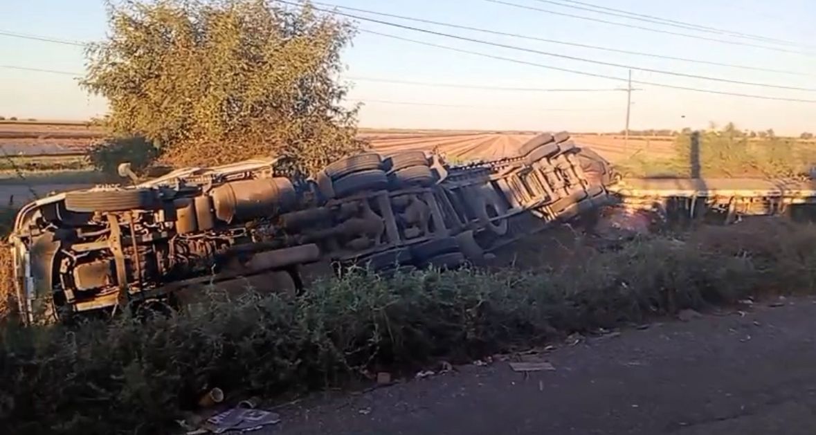 El accidente se reportó a las 02:10 del medio día de este miércoles, cuando la pesada unidad intentó dar vuelta por el bulevar Juan S. Millán y bulevar Insurgentes de la colonia Ejidal en esta ciudad de Guasave, pero al parecer el peso del material que trasladaba se recargó hacia lado derecho y terminó volcado con la cabina levantada.
